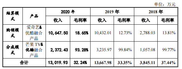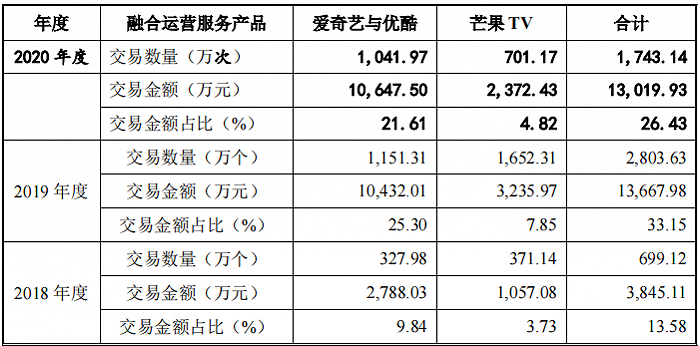 2018-2020三个年度,蜂助手给爱奇艺、优酷、芒果TV提供的融合运营服务产品(“运营商流量+视频会员”,三文娱在下文将对此模式进行说明),交易金额分别达3845.11万、1.37亿、1.30亿元。