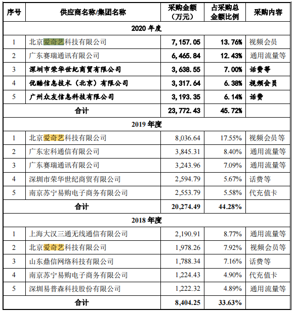 2018-2020三个年度,蜂助手向北京爱奇艺科技有限公司采购视频会员的金额分别为1978.26万、8036.64万、7157.05万元;2020年度,蜂助手向优酷信息技术(北京)有限公司采购视频会员的金额为3317.64万元(也会向其他供应商采购)。
