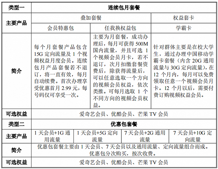 蜂助手的“运营商流量+视频权益”融合产品,按会员类型分为VIP 卡、超级VIP 卡、黄金VIP卡等,按有效时限分为日卡、 周卡、月卡、季卡、半年卡、年卡等,按配套流量分为通用流量、定向视频流量等,按客户群体定位分为学生卡、非学生卡等,按续费要求分为按次收费、连续包月等。