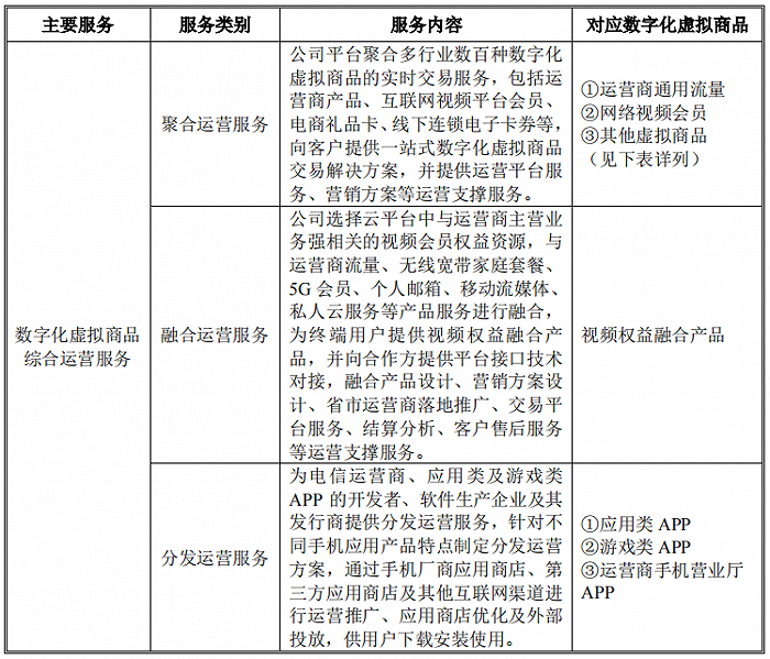 蜂助手提供虚拟商品聚合运营服务,主要为运营商、互联网、电商等平台提供虚拟商品,比如视频平台会员、运营商流量套餐、电商礼品卡、线下连锁电子卡券等,并提供营销方案等运营支撑服务,获取服务酬金或购销差价。