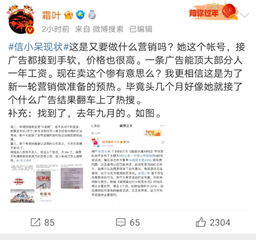 甚至有人质疑她这次卖惨是又一次营销。比如,微博百万粉丝大V霜叶称:“这是要做什么营销吗?她这个账号,接广告都接到手软,价格也很高。一条广告能顶大部分人一年的工资。现在卖这个惨有意思么?我更相信这是为了新一轮营销做准备的预热。”