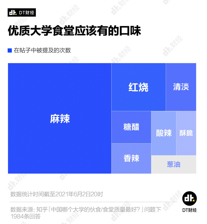 特质之外,一家优秀的大学食堂,在口味上又有着什么样的优势呢?在上榜的高校中,麻辣口味是一家受欢迎的食堂被提及最多的口味,此外红烧、清淡、糖醋、香辣、酸辣都有上榜。
