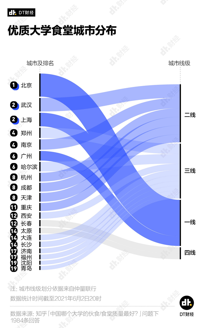 不难发现,拥有优质食堂的大学,较多分布于一二线城市。这也许与一二线城市在教育资源上的优势分不开。