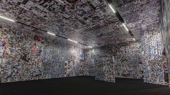 在北京红砖美术馆5月28日开幕的“图像超市”展览现场,你会得到一个具象的答案——令人窒息的图像铺天盖地充斥视线。从脚底到头顶,直至天花板,密密麻麻的图片堆叠出一个无法喘息的空间,站近了,仔细看,里面有艺术家的家庭照片、广告横幅,以及他看过的各种屏幕截图、访问过的网站信息等。