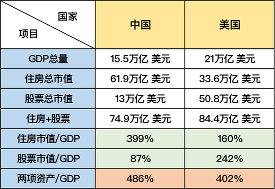 这些年,每过一段时间就会炒一波“中国几大一线城市的房产市值可以买下美国”,其实是因为中美两国的资产配置不一样。美国家庭资产配置在房产上的占比较小,配置在金融资产上的更多。将两国各自的房产和股票价值加总就会发现,中国比美国还要少一些。所以,美国怕股市跌,这跟中国怕房价跌是一样的道理。