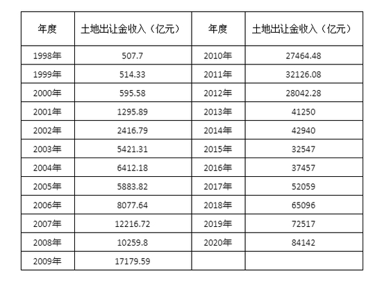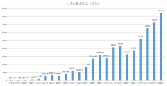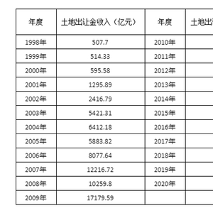 以下是1998-2020年,全国国有土地使用权出让金收入。其中,1998-2012年的数据来自《中国国土资源统计年鉴》的土地出让金数据;2013-2020年数据来自财政部,为国有土地使用权出让金收入。
