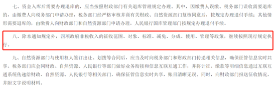 其次,《通知》的第八条明确指出:除本通知规定外,四项政府非税收入的征收范围、对象、标准、减免、分成、使用、管理等政策,继续按照现行规定执行。