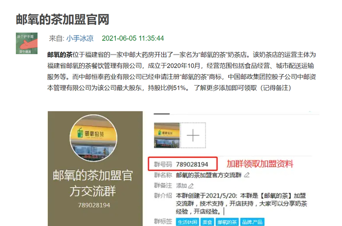 成为网红奶茶店之前,“邮氧的茶”的加盟信息已在网络上流传,其中包括官网、加盟申请QQ群、App链接等。
