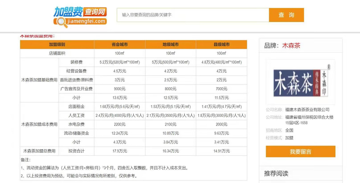 时代周报记者获得的相关加盟资料显示,目前,木森茶已开设12家加盟店,加盟费用分为基本费用和成本费用,总费用从县级城市、地级城市、省级城市分为三个等级,依次为14.91万、16.34万和17.9万元。