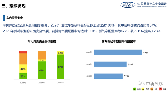 综合2020年C-IASI完成的23款车型,正面安全气囊、侧气囊配置率均达到100%,侧气帘配置率达到87%,较2019年提高了28%;