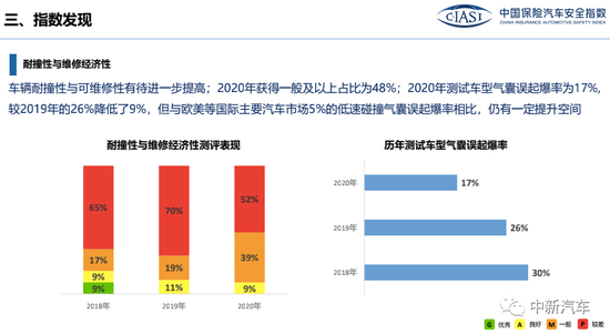 此外,综合2020年C-IASI完成的23款车型的车辆耐撞性与可维修性成绩,2020年测试车型气囊误起爆率为17%,相较于2019年的26%下降9个百分点,但与欧美等国际主要汽车市场5%的起爆率相比,还有待进一步提升;