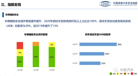 综合2020年C-IASI完成的23款车型,车辆辅助安全方面,车辆自动紧急制动系统(AEB)标配率已达到39%,同比提升13%。