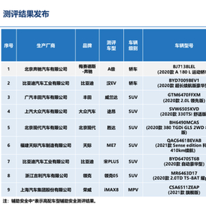 最新公布成绩的9款车型包括2款轿车、6款SUV及1款MPV。分别为北京奔驰A级、比亚迪汉、丰田威兰达、上汽大众途昂、北京现代胜达、天际ME7、比亚迪宋PLUS、吉利领克05、上汽乘用车荣威iMAX8。
