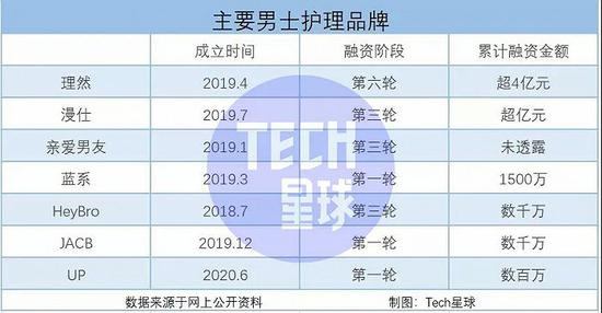 在融资的赛道上,各个品牌也态势强劲,以理然最盛。2019年成立的理然定位是男士综合个护, 目前已获得六轮融资。值得注意的是,男性社区虎扑和B站都投资了这家企业。