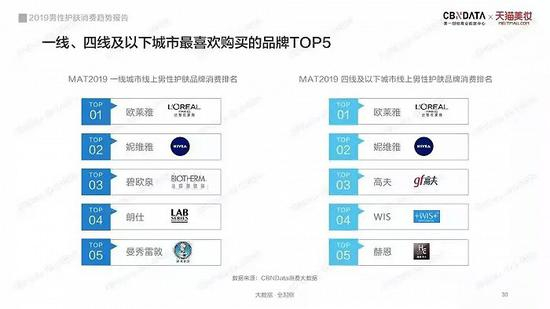 长期以来,男性洗护市场份额都是被外资品牌所占据,如欧莱雅男士、资生堂男士、妮维雅和曼秀雷敦等,还有少部分国产品牌高夫、赫恩、杰威尔、波斯顿和百雀羚等。MAT2019一线城市线上护肤品牌消费排名显示,前五名都是外资品牌,四线及以下城市消费排名top5中,也仅有两家国产品牌。