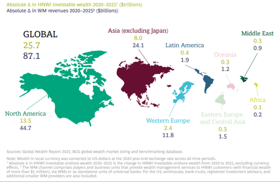 纵观全球市场,BCG预测在下一个五年里,亚洲(不包括日本)及北美市场将引领全球金融财富的增速。