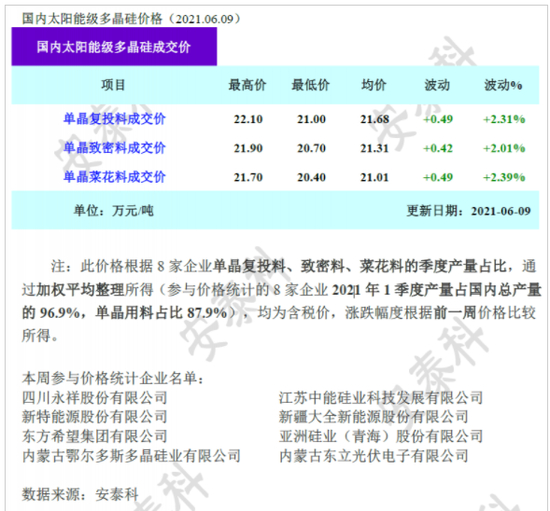 根据6月9日,中国有色金属工业协会硅业分会(下称硅业分会)公布了最新一期的多晶硅料价格数据,今年年初国内单晶复投料的均价为8.76万元/吨,国内单晶致密料已经连续23周上涨,最新的成交均价涨至21.31万元/吨,与年初相比,涨幅高达150.71%。