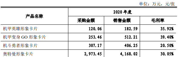 招股书显示,2020年度华立科技卖出了4168.02万人民币的奥特曼卡片,毛利率高达30%,占总类目的63.24%。相比之下,龙珠卡、机甲变身Go卡、机斗勇者卡、宝可梦卡、机甲英雄卡等其他IP的卡片分别卖出630.22万、512.21万、406.25万、391.27万和182.59万元,仅仅是奥特曼卡片的十分之一乃至零头。