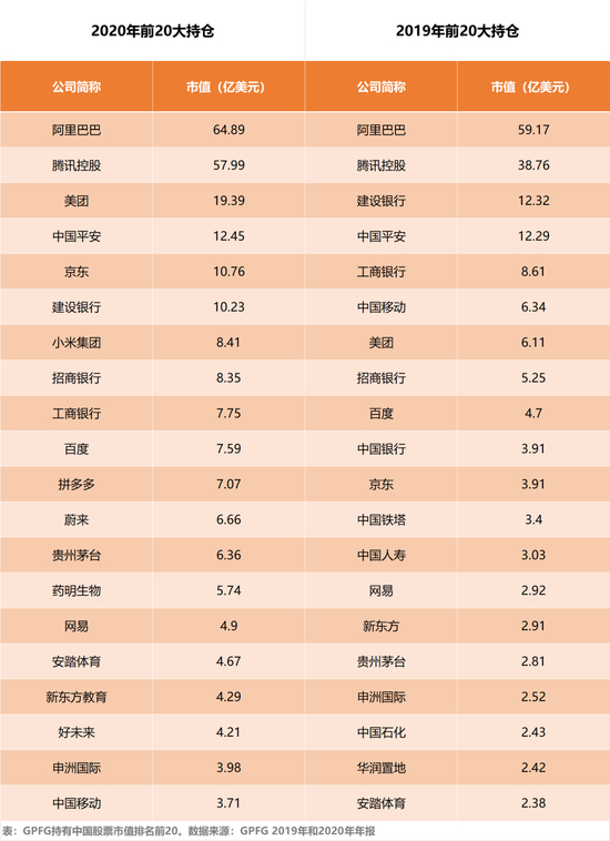 基金重仓的前 20 大中国公司股票中,核心资产特征明确。科技股持仓数量和持仓市值都是最高的,包括阿里巴巴、腾讯、美团和京东等去年表现出色的股票。此外,相比2019年,基金持有金融股的市值大幅下降。