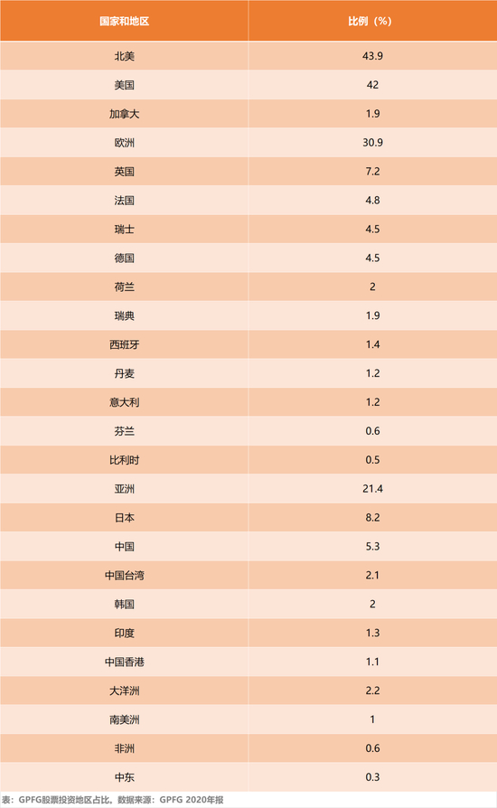 从国家和地区上看,GPFG最主要的投资地点在美国,其次是欧洲,亚洲最大的投资国是日本,中国内地股市占比5.3%