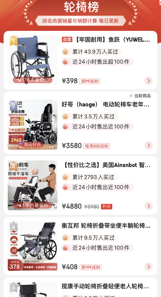 亿欧EqualOcean在京东、淘宝等电商平台搜索“轮椅”字样时,发现电动智能轮椅占“轮椅类”排行榜的TOP5中的两席。