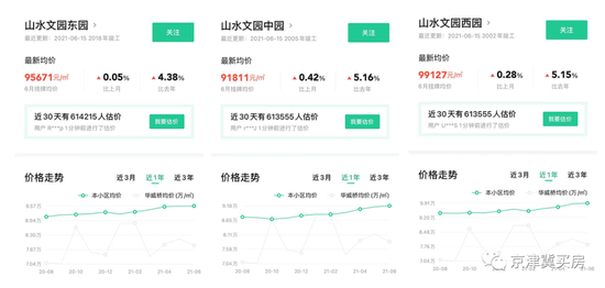 6月15日,山水文园东园挂牌均价9.57万/平,较去年上涨4.38%;山水文园中园挂牌均价9.18万/平,较去年上涨5.16%;山水文园西园挂牌均价9.91万/平,较去年上涨5.15%。
