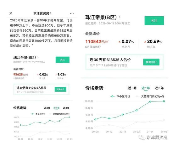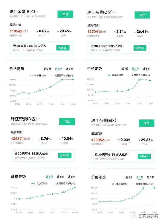 珠江帝景E区目前在安居客上挂牌价123052元/平,比去年同比上涨了29.85%。从2021年1月开始,珠江帝景E区单价开始上扬,2021年2月挂牌价10.36万/平,3月均价11.01万/平,4月均价12.28万/平,6月均价12.3万/平。E区半年来涨了18%多。