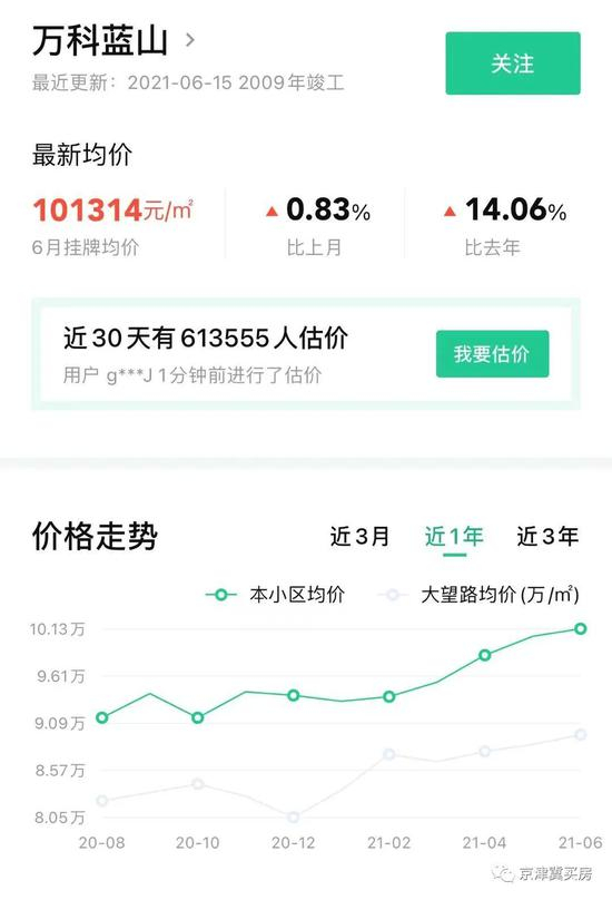 2020年12月-2021年2月,当大望路区域上涨时,万科蓝山价格变动幅度不大,2月挂牌均价9.38万/平,也就是自2月开始,万科蓝山均价开始持续上涨,4月挂牌均价9.84万/平,6月10.13万/平。