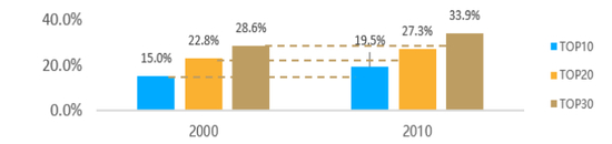 图为2000-2010年中国独居区域集中度变迁