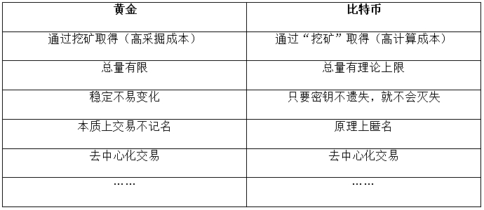 我们不妨先来对比一下比特币和黄金的相似之处: