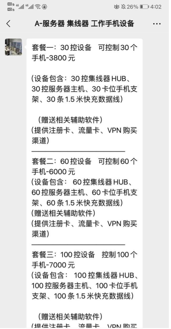 这名商家告诉记者,一套群控设备可以控制30-100台手机不等,可控制手机数量越多所需价格越高,可控制手机30台、60台、100台的群控设备价格分别为3800元、6000元、7000元。此外,商家还向记者透露,购买群控设备可以赠送相应数量的注册手机号码,并且提供购买手机的渠道,手机单价为270-370元不等。据了解,在其他销售商家处,部分群控设备最多可以控制2万台手机。