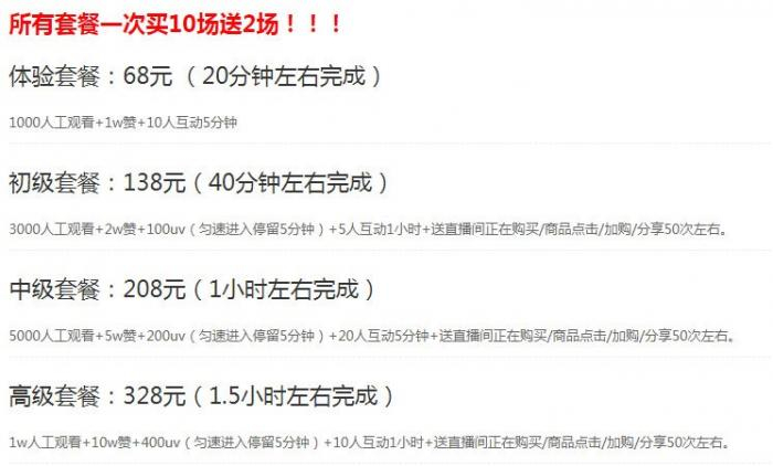 如果说上述商家是以控制设备数为标准出售直播服务,那么不少打着“一站式直播服务”旗号的商家和网站则更为清晰的量化了观看人数,商品点击次数。此前有媒体报道,在一家直播服务网站,只需花费328元购买高级套餐,就能在一个半小时内实现1万人正在观看、10万次点赞、显示正在购买50次,一场0人直播可以在瞬间被打造为万人直播。