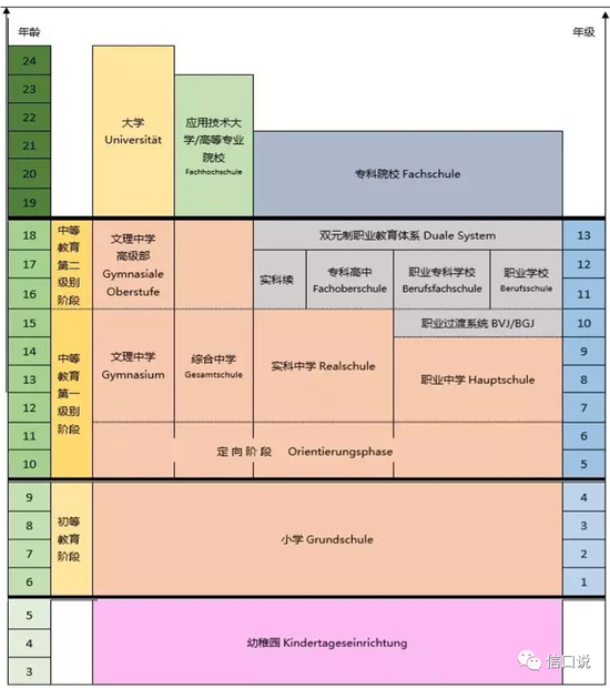 学前三年、小学四年。小学毕业后分流进入四种不同类型的中学:文理中学、职业中学、实科中学和综合中学。
