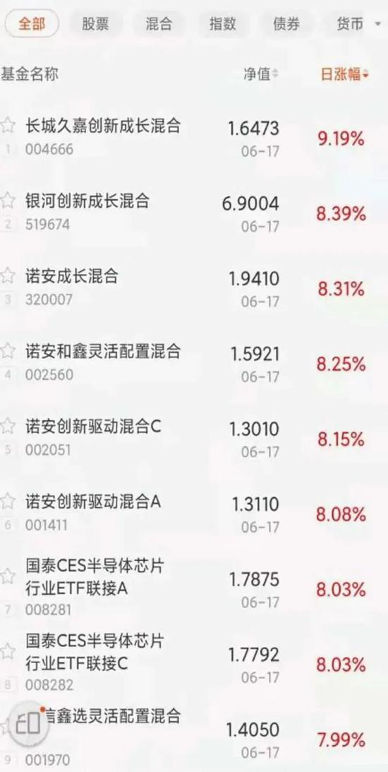 东财Choice数据显示,30多只基金6月17日的净值涨幅超过5%。其中,百亿基金经理蔡嵩松管理的诺安成长、诺安和鑫、诺安创新驱动等3只基金净值涨幅均超过8%,其中诺安成长基金净值上涨最高,涨幅为8.31%。
