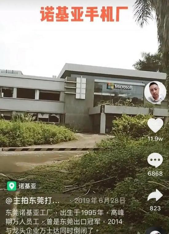 侯国安拍的诺基亚手机厂的视频,这是频道里获赞最多的一条视频。图片截图自其抖音