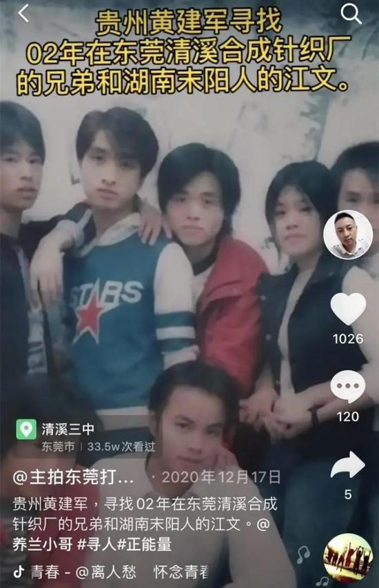 他会用视频配上寻人者的老照片、工作年份,有的人连照片都没存,侯国安只能用工厂和街区的画面来配寻人启事。刘方平用自己以前的工作照发过一则寻人,已经找回了28个同期工友,组建了一个微信群。老工友们聊得很投机,“以前的朋友才是真朋友”。