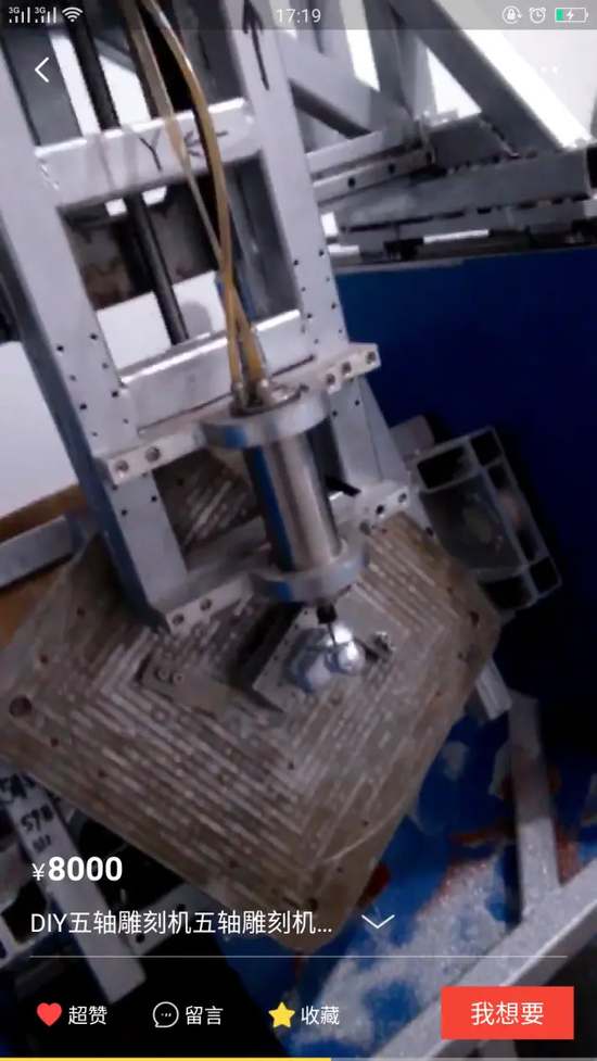 大星有一次在闲鱼圈子里发现了一台一台五轴雕刻机。那时候,“卡脖子”的问题还没有很急迫,网友自制的这台机器,虽然焊接痕迹比较粗糙,但除了常见的xyz三个直线运动轴之外,还有ab两个旋转运动轴,可以一次性加工各种复杂件。