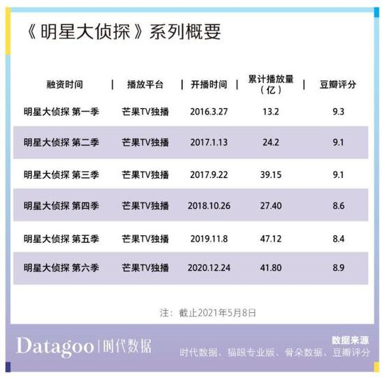 2016年,《明星大侦探》第一季播出,首播上线两小时,收视率即突破千万。目前在豆瓣上累计12.8万人看过这一季节目,打出了9.3的高分。