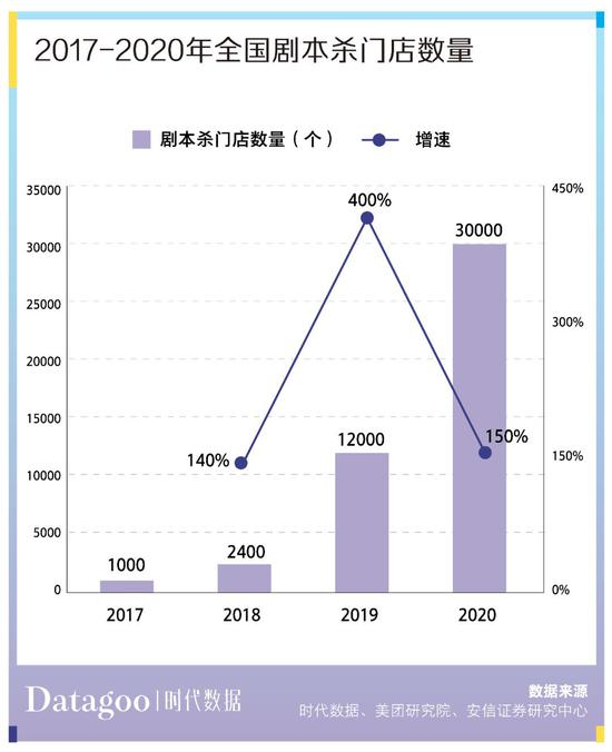 消费者付费意愿高,再加上一些媒体报道的“年入百万”神话,刺激着越来越多的人跑步入场,不少高能玩家直接变身店长圈地扩张。2017年,线下门店数量才刚刚破千。两年后就飙升至12000家。据美团统计,目前全国剧本杀相关门店数量已经超过3万家。