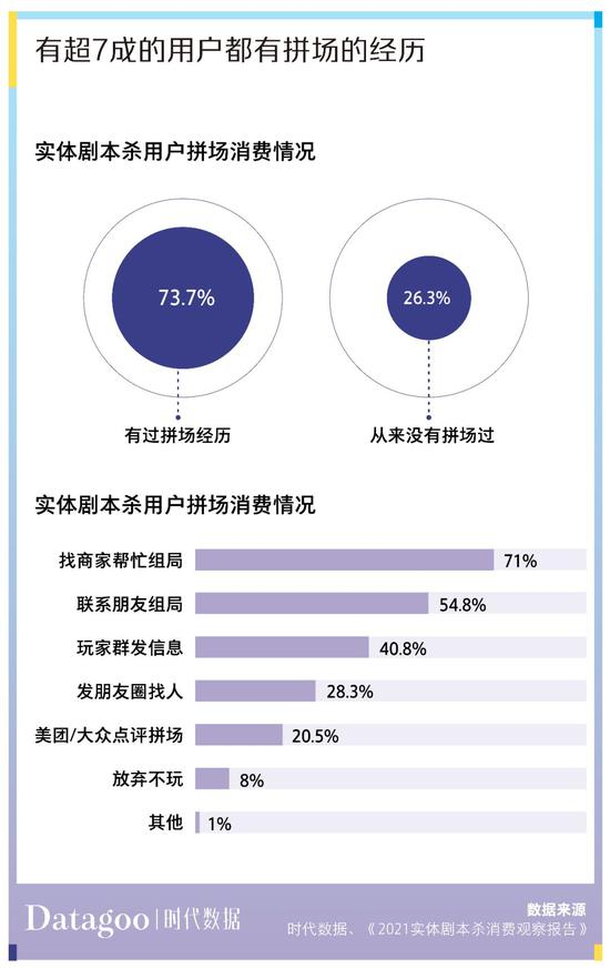 一局游戏,最低4个人,多到15人也能共同参与。如果你想玩,很难凑齐数量那么多,此刻又刚好有时间且愿意陪你的熟人。因此和陌生人一起拼场是常有的事情。根据调查,在实体剧本杀用户中,有超7成的用户都有拼场的经历。
