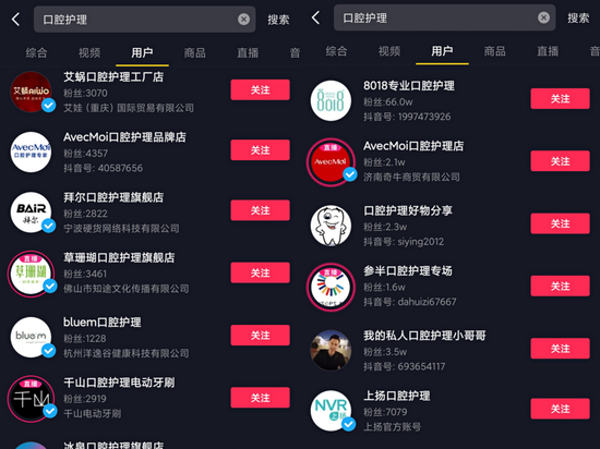 用户也吃这一套,相关内容很容易火。现如今,在短视频平台搜索“口腔护理”,认证为美妆博主、口腔科医生、口腔医院等各种账号层出不穷。借助于对口腔护理相关知识的分享,这些博主们的粉丝数量也从几千、几万到几十万不等。