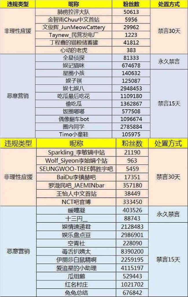 上一周,微博发布公告,落实国家网信办2021“清朗·‘饭圈’乱象整治”系列专项行动的相关要求。据微博管理员账号显示,在5月21启动微博“粉圈健康生态专项行动”以来,截至目前,微博共处理「全星侦探」、「娱记喵咪」、「暖瞳凝」、「十三円_」四个账号被永久禁言,43个账号被禁言15天,30个账号被禁言30天,其中涉及流量明星的非理性应援和恶意营销。与此同时,对395个黑粉账号予以7天到永久禁言的处置。
