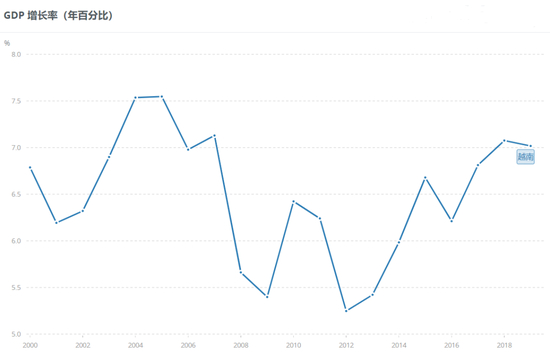 2000年以来,越南的GDP多数年份保持6%以上的增速,仅有4年处于5%-6%的区间。