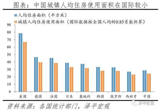 另一方面,中国家庭户规模迅速小型化,导致当今更多的住房和更大的人均住房面积需求。因生育率下滑、晚婚、不婚率和离婚率提高、寿命延长、人口流动等因素,家庭规模小型化是世界各国人口发展的普遍趋势。当前日本、美国、韩国家庭户均规模分别降至2.27、2.53、2.4人。中国家庭户均规模从1982年的4.41迅速降至2020年的2.62;家庭户规模缩小,主要是受我国人口流动日趋频繁和住房条件改善年轻人婚后独立居住等因素的影响。因此,如果以人均使用面积28平即人均建筑面积40平为标准算,未来中国城镇人均住房面积存在约13%的改善空间。