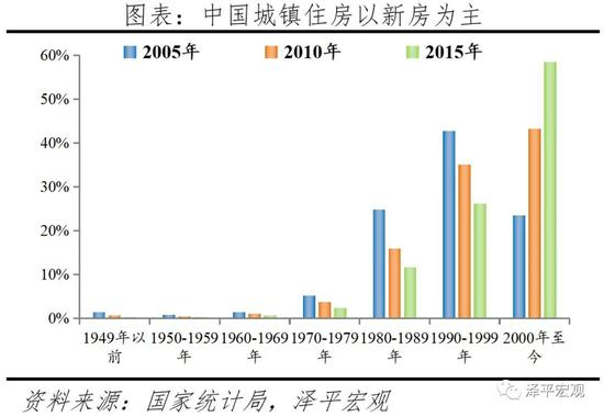 随着1990年代住房制度改革推进,特别是1998年国务院下发《关于进一步深化城镇住房制度改革加快住房建设的通知》后,商品住宅带动城镇住宅竣工面积大幅攀升。按照国家统计局的口径估算,1978年全国城镇竣工住宅面积不足1亿平,1998年超过5亿平,2011年超过10亿平;其中,竣工商品住宅面积占城镇竣工住宅面积占比从1995-1999年的不足32%,跃升至2000年的38%,2003年超过60%,2007年超过70%;从全国人口普查和小普查资料的房龄结构数据看,有约97%的城镇住房为1978年以来建造,约87%为1990年以来建造,约60%的城镇住房为2000年以来建造。与中国不同,欧美发达经济体的住房平均房龄较老,比如英国、美国住房房龄超过50年的比例均超过40%,超过100年房龄的比例分别为20%、7%。