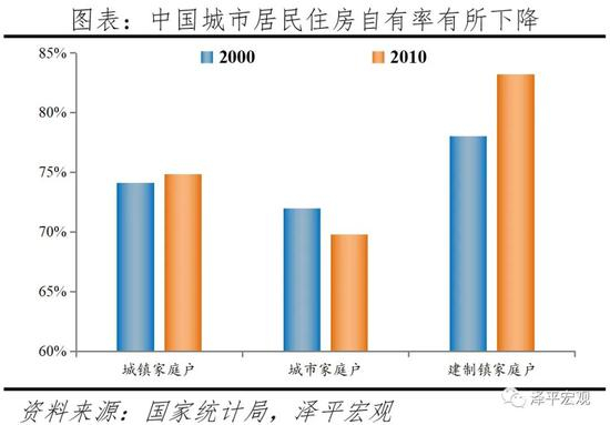 中国城镇居民约70%居住在自有住房,约20%租房,其他10%为借住、住单位宿舍等;与建制镇居民相比,城市居民住房自有率更低且呈下降趋势、租房比重更高且呈上升趋势。根据2000年人口普查资料家庭户住房来源统计,有74.1%的城镇家庭户居住在自有住房,有20.5%的租房,还有5.4%的住房来源为其他(比如,借住亲友住房但不付租金,住单位单人或夫妻宿舍但不付租金等情况)。到2010年,上述比例分别为74.9%、21.0%、4.1%。此外,2005年、2015年小普查统计的城镇家庭户住房自有率分别为77.9%、79.2%,住房自有率偏高,可能存在抽样问题。
