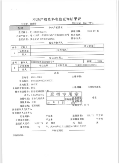 不动产权资料电脑查询结果表显示,标的物建筑面积228.72平方米,不动产证号为粤(2017)深圳市不动产权第0180287号,登记价316.9179万元,登记时间为2017年9月20日。该房源位于恒裕滨城3座A单元40层,A楼栋总层高为46层,为东南朝向四居室,起拍价5618万元。