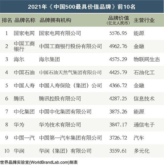 中国500最具价值品牌前10名包括国网、工行、海尔、中国石油、中国人寿、腾讯、中化集团、华为、中国一汽和华润。