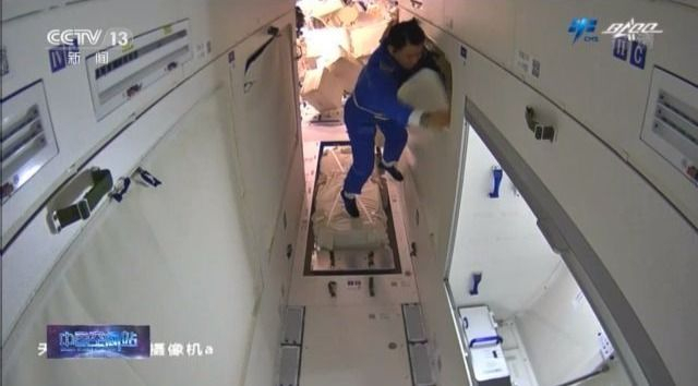 在镜头左下方,航天员汤洪波在开始一天的工作之前,还要整理一下个人卫生。在地球上再简单不过的洗脸、刷牙、刮胡子,在太空做起来都会大不同。在太空的失重环境中,悬浮的水珠极易被吸入肺中,造成窒息。所以汤洪波洗脸就是用免洗湿纸巾清洁面部,刷牙则是把装在小袋子里的牙膏直接挤在嘴里,进行清洁后直接咽进肚子里。这样看来,这个独立的睡眠区不仅可以用来睡觉,还是个可以供航天员洗漱、娱乐、以及和家人联络的私密空间。让航天员三个月的工作生活有了更好的体验。
