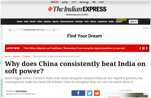 中国在硬实力——经济实力加上军事实力——上优于印度,这是众所周知的。但是知道中国的软实力也同样具有优势的人并不多。软实力是说服别人做你想做的事。软实力理论家认为,说服能力,取决于吸引力的力量。我们印度人认为自己比中国更具影响力,但数据显示并非如此。